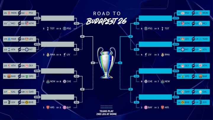 淘汰赛附加赛的8支获胜球队将晋级欧冠16强,16强抽签仪式将于2026年2月27日(周五) 举行。