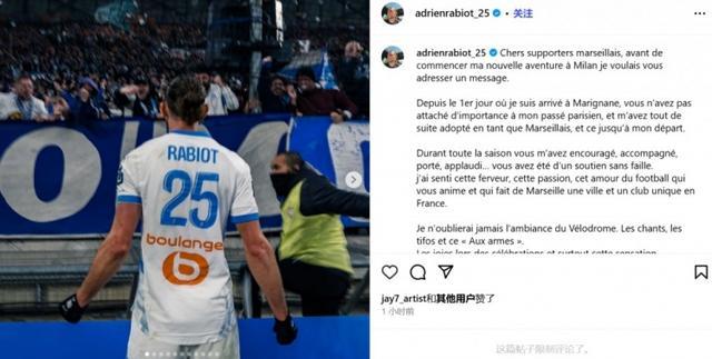 拉比奥特写道:“亲爱的马赛球迷,在我开启米兰的新冒险之前,我想给你们写一条留言。从我第一天抵达马赛开始,你们从未在意我过去在巴黎的经历,反而立刻接纳了我,把我当成马赛人,直到我离开。”