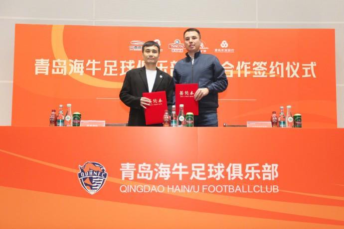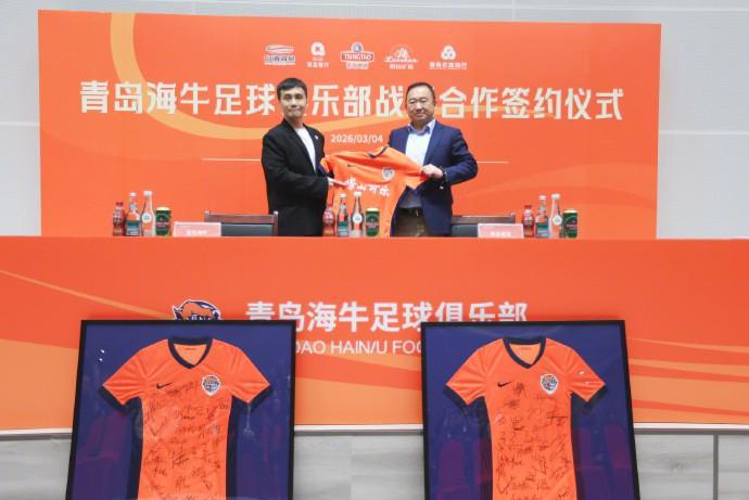 “3月4日,青岛海牛足球俱乐部2026赛季出征仪式在城阳区青春足球场圆满举行。2026赛季,青岛海牛足球俱乐部将携手青岛本土品牌青岛啤酒、青岛饮料集团、青岛银行、青岛农商银行一同为这座城市的荣誉而战,出征仪式中,俱乐部与该4大品牌进行了签约仪式,携手向前。活动期间,新赛季球衣由部分球员展示,胸前广告‘崂山可乐’首次亮相。”