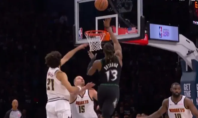 第四节比赛中,多森姆迎着约基奇和默里高难度抛投打进,已经砍下34分,森林狼继续领先13分。